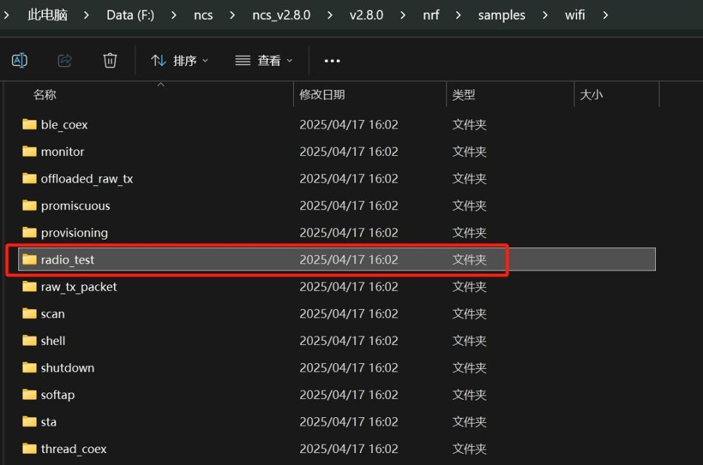 1. Copy the WiFi radio_test example code in NCS (..\nrf\samples\wifi\radio_test) to a commonly used folder. Avoid non-English characters in the path.