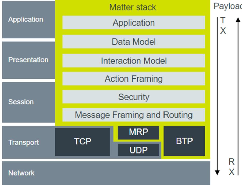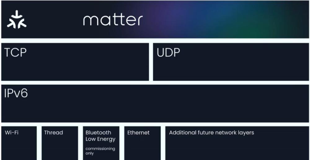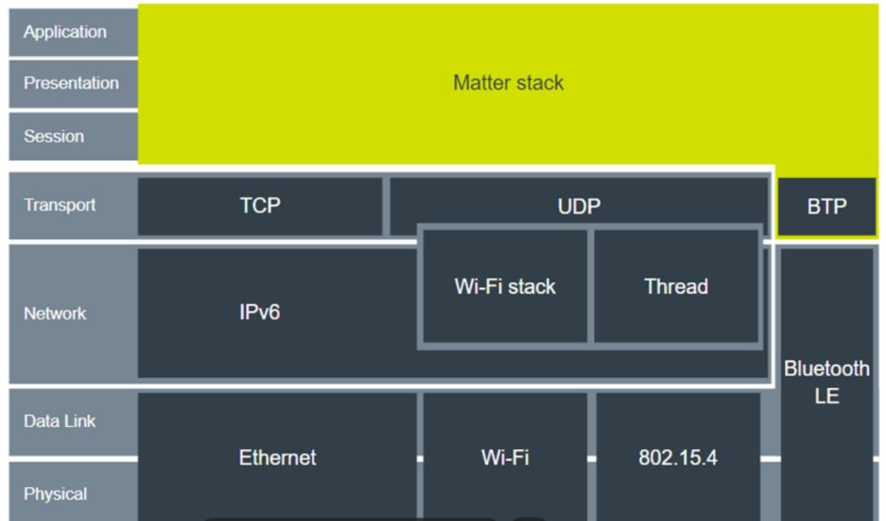Matter is an IPv6-based application layer protocol that runs on top of TCP/IP. It supports multiple link layer technologies, including Wi-Fi, Thread (based on IEEE 802.15.4), and Ethernet. Bluetooth Low Energy (BLE) is primarily used for device commissioning. This design allows Matter to fully leverage existing home network infrastructure.