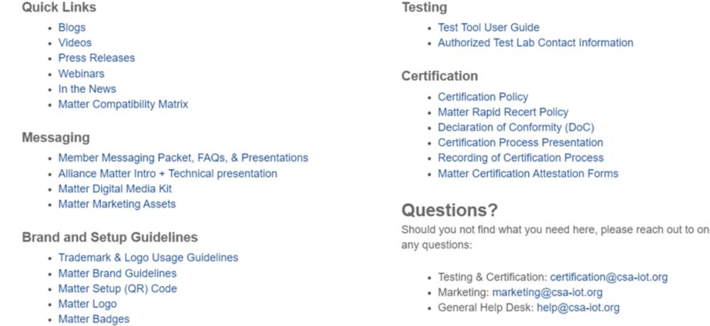 Unlike Bluetooth and Wi-Fi, which can still be used even if you don't pass certification, Matter relies on PKI technology and is an application specification. Therefore, you must pass Matter certification to use Matter technology. CSA provides a variety of resources to help you learn about Matter. You can refer to the following resource websites: