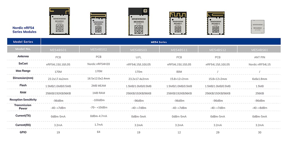 The ME54 series modules use the Nordic nRF54 series SoCs as the main control. Compared with the Nordic nRF52 and Nordic nRF53 series, the performance and process have been greatly improved, and the price is relatively favorable.