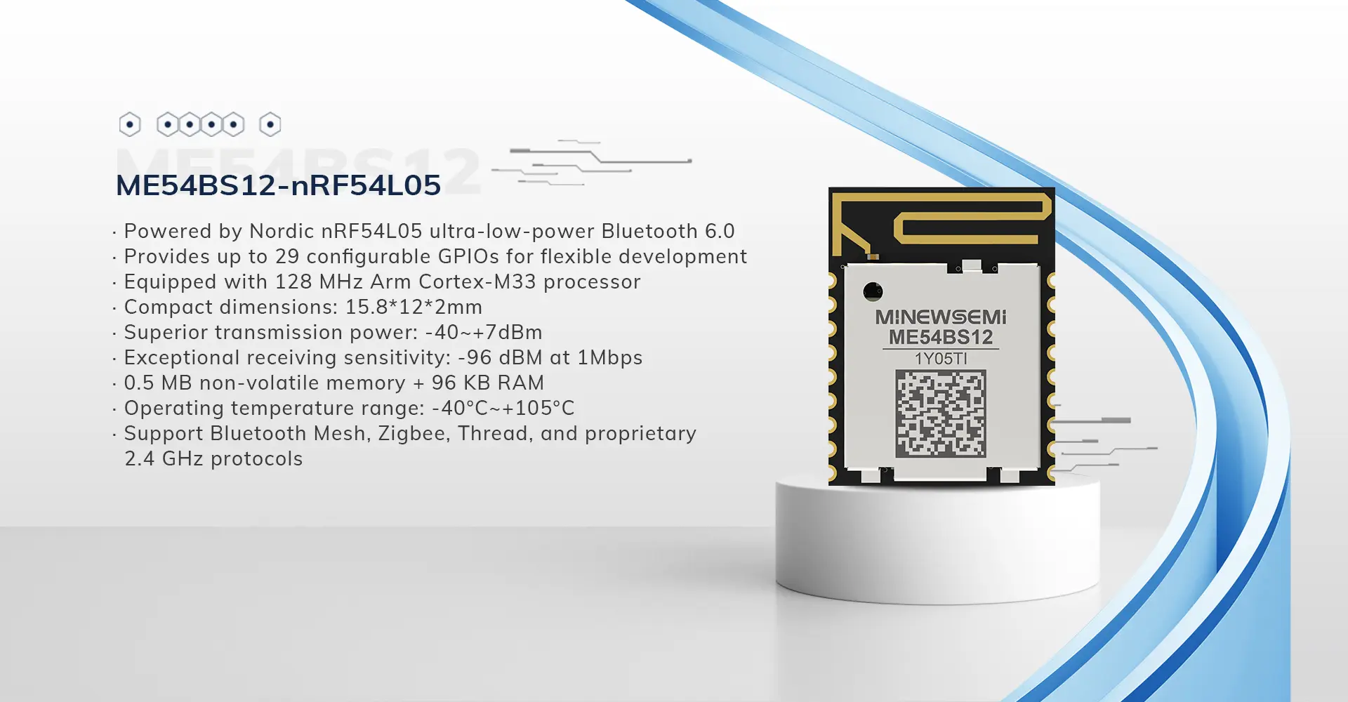 The ME54BS12 is a highly flexible, ultra-low-power, and cost-effective Bluetooth module based on the Nordic nRF54L05 chip. It features a powerful Arm® Cortex®-M33 CPU running at up to 128 MHz, along with 0.5 MB of NVM and 96 KB of RAM. The hardware includes an onboard antenna with an integrated design that highlights the enhanced performance of the nRF54 series. It also offers 29 GPIOs for development, ultra-low system power consumption, excellent RF performance, and a range of powerful supporting resources, making it an ideal solution for Bluetooth connectivity.