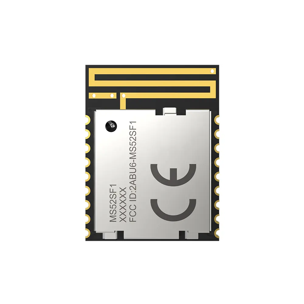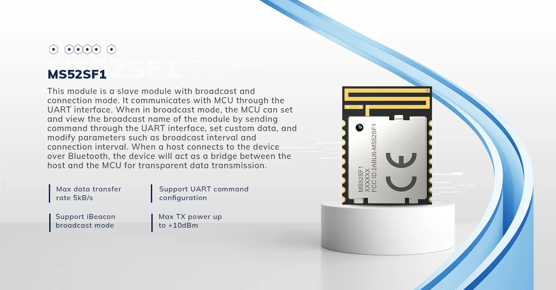 MS52SF1 is a module with Bluetooth slave device firmware designed using Tailing Micro TLSR8208G chip. It has broadcast and connection status, and uses UART interface to transparently transmit data between main devices such as mobile phones/tablets and MCU. Bluetooth functionality can be added to the product without the need for Bluetooth development, providing convenience for product development. The device broadcast communicates with the MCU through the UART interface. In broadcast mode, the MCU can set and view the module's broadcast name in command format, set custom data, modify parameters such as broadcast interval and connection interval through the UART interface. When a host connects to a device through Bluetooth, the device will act as a bridge between the host and the MCU for transparent data transmission.
