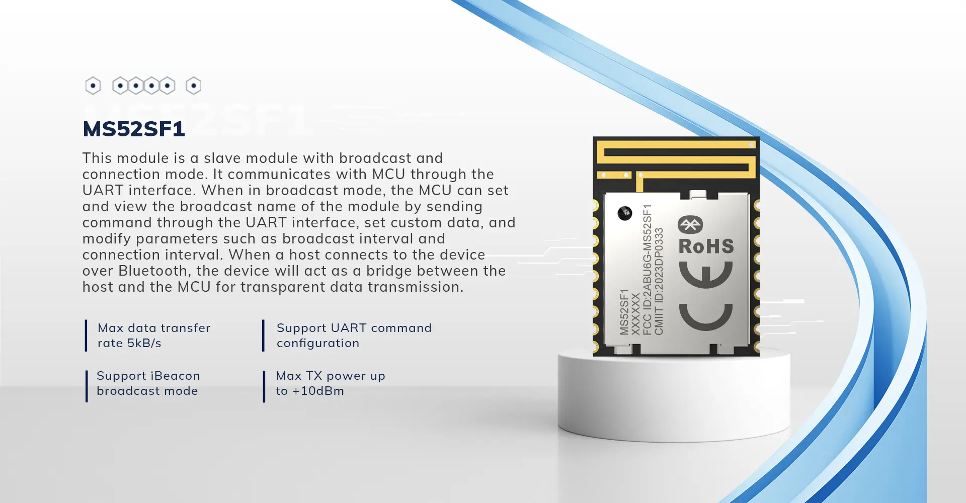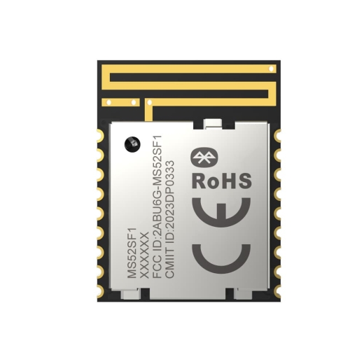 MS52SF1 is a module with Bluetooth slave device firmware designed using Tailing Micro TLSR8208G chip. It has broadcast and connection status, and uses UART interface to transparently transmit data between main devices such as mobile phones/tablets and MCU. Bluetooth functionality can be added to the product without the need for Bluetooth development, providing convenience for product development. The device broadcasts to communicate with the MCU through the UART interface. In broadcast mode, the MCU can set and view the module's broadcast name in command format, set custom data, modify parameters such as broadcast interval and connection interval through the UART interface. When a host connects to a device through Bluetooth, the device will act as a bridge between the host and the MCU for transparent data transmission.