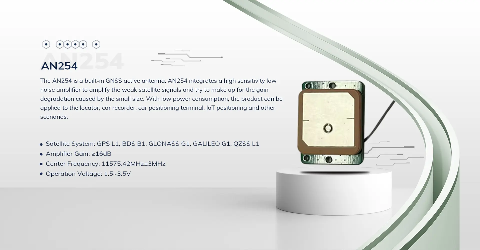The AN254 series is a built-in GNSS active antenna. AN254 integrates a high sensitivity low noise amplifier to amplify the weak satellite signals and try to make up for the gain degradation caused by the small size. With low power consumption, the product can be applied to locator, car recorder, car positioning terminal, IoT positioning and other scenarios.