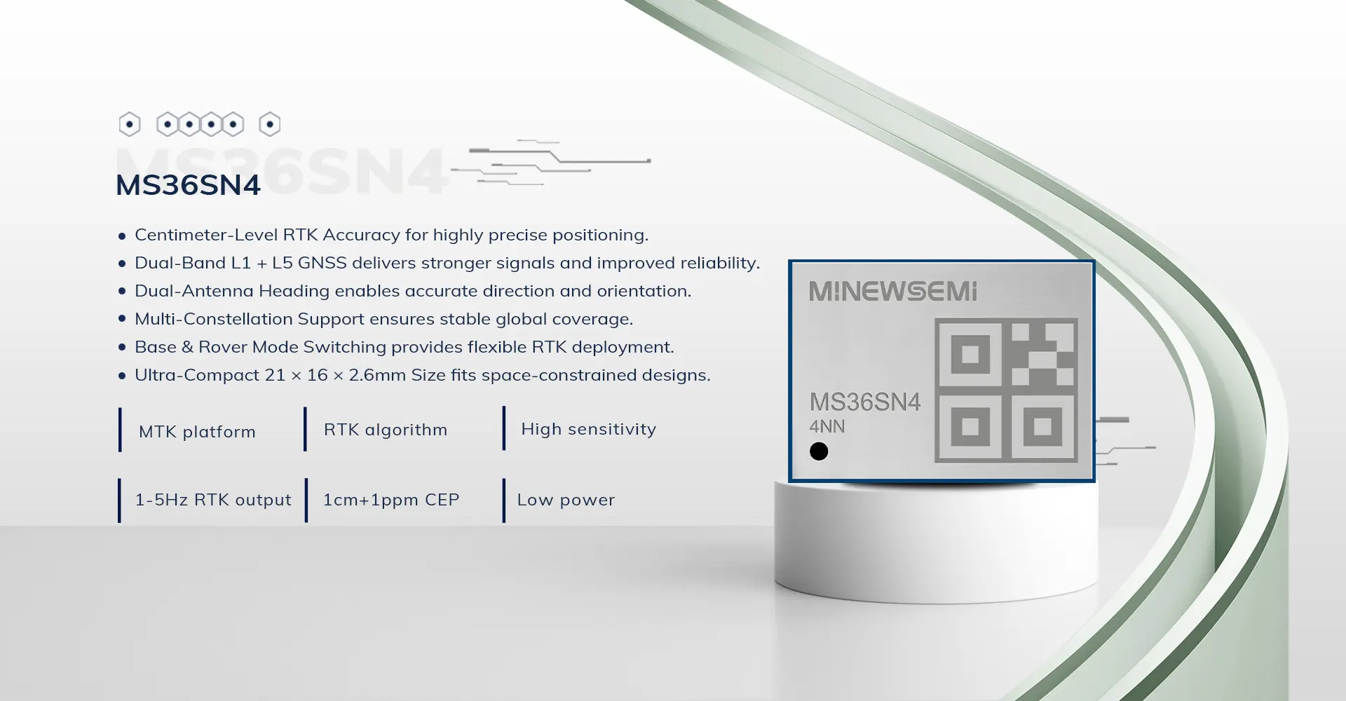 The MS36SN4 is a GNSS module with built-in RTK positioning, supporting multi-constellation positioning on L1 and L5 bands. It employs a 12nm GNSS SoC chip with a powerful 530MHz ARM Cortex-M4 processor, including FPU and MPU functions. Compatible with GPS, BeiDou, GLONASS, Galileo, and QZSS systems, the module utilizes RTK technology for centimeter-level accuracy and low power use. Its dual chips enable precise azimuth and static attitude measurement. With exceptional performance, the MS36SN4 suits applications like drones, lawnmowers, and precision agriculture.