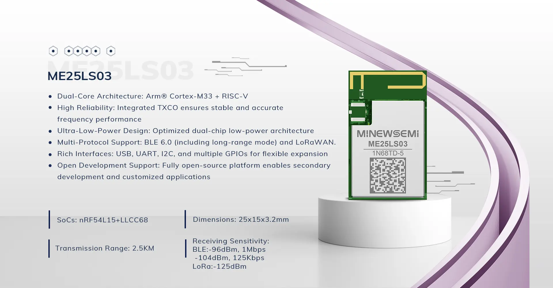 ME25LS03 is a high-performance, long-range, ultra-low-power, and compact wireless module that supports multiple protocols, including BLE 6.0 and LoRaWAN. It features 256 KB RAM and 1.5 MB Flash, providing ample storage for complex applications.