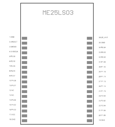 The module offers excellent receiver sensitivity, reaching -104 dBm (BLE) and -146 dBm (LoRa), with a maximum transmit power of +8 dBm (BLE) and +22 dBm (LoRa), enabling reliable long-distance communication. Powered at 3.3 V, the ME25LS03 includes a built-in 32 kHz crystal and provides a rich set of GPIO interfaces.