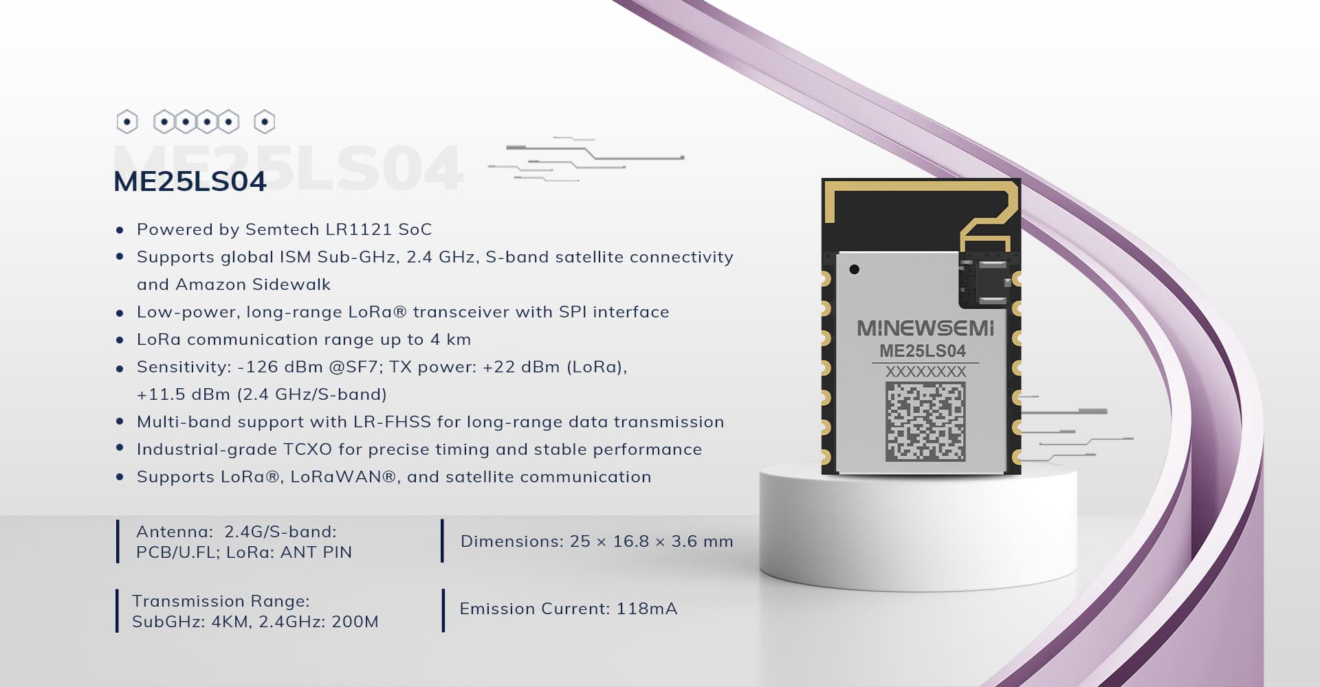 ME25LS04 is based on Semtech's third-generation LoRa wireless transceiver LR1121, supporting global ISM Sub-GHz and 2.4 GHz frequency bands as well as S-band satellite connectivity. It is an ultra-low-power, long-range, compact LoRa® transceiver module with an easy-to-use SPI interface.
