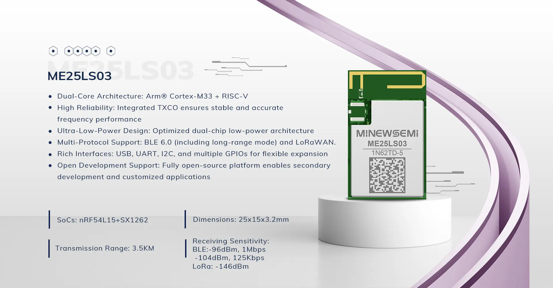 Operating at 3.3 V, the ME25LS03 integrates a built-in 32 kHz crystal oscillator and offers a wide range of GPIO interfaces for flexible hardware expansion. In addition, it is backed by a fully open development platform, enabling fast product development, firmware customization, and secondary application development.